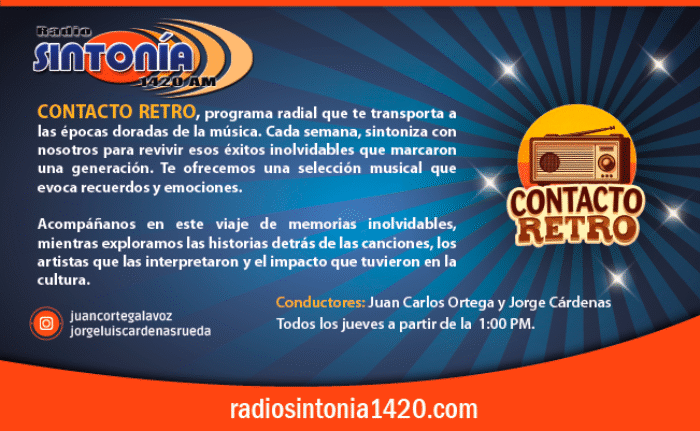 Te invitamos a escuchar «CONTACTO RETRO», un espacio muy especial, con Juan Carlos Ortega y Jorge Luís Cárdenas.