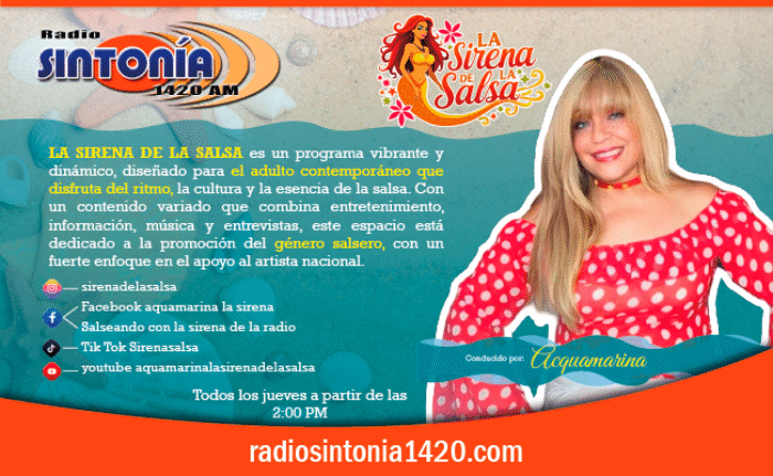 - Redes SocialesInstagram: @sirenadelasalsa Facebook: Aquamarina la sirena. Salseando con la sirena de la salsa. Tik tok: sirenasalsa Youtube: aquamarinalasirenadelasalsa